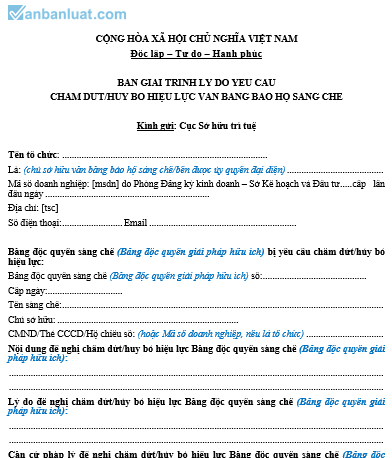 Nội dung đề nghị chấm dứt/hủy bỏ hiệu lực Bằng độc quyền sáng chế (Bằng độc quyền giải pháp hữu ích):