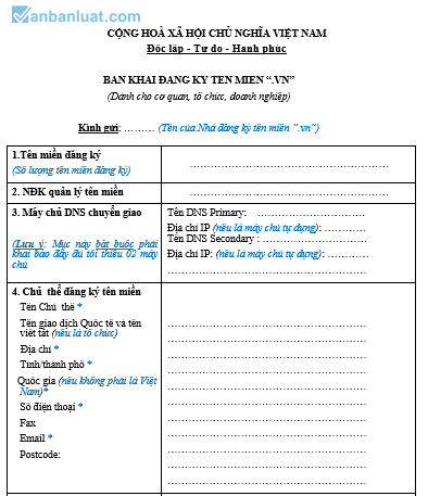 BẢN KHAI ĐĂNG Ký TÊN MIỀN “.VN”