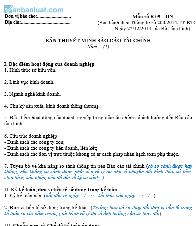 Bản thuyết minh báo cáo tài chính - Ban hành theo Thông tư số 200/2014/TT-BTC Ngày 22/12/2014 của Bộ Tài chính