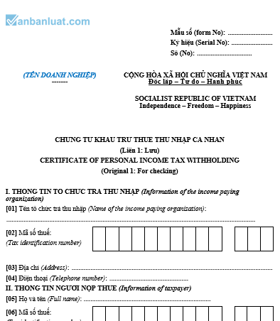 CHỨNG TỪ KHẤU TRỪ THUẾ THU NHẬP CÁ NHÂN