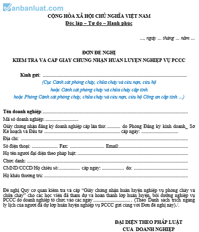 ĐƠN ĐỀ NGHỊ KIỂM TRA VÀ CẤP GIẤY CHỨNG NHẬN HUẤN LUYỆN NGHIỆP VỤ PHÒNG CHÁY CHỮA CHÁY