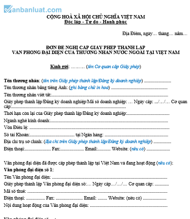 Đề nghị cấp Giấy phép thành lập Văn phòng đại diện số … (Thương nhân tự khai báo trên cơ sở thứ tự các Văn phòng đại diện đã được cấp phép trước đó) như sau: