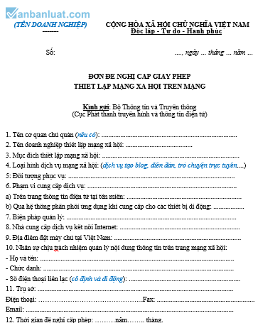 Đơn đề nghị cấp giấy phép thiết lập mạng xã hội trong công ty TNHH một thành viên