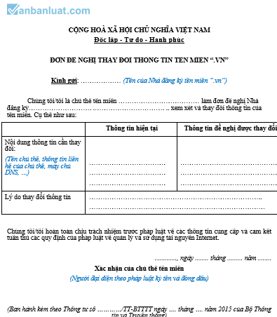 Đơn đề nghị thay đổi thông tin tên miền Việt Nam - được ban hành tại Phụ lục số 4 Ban hành kèm theo Thông tư số  24/2015/TT-BTTTT