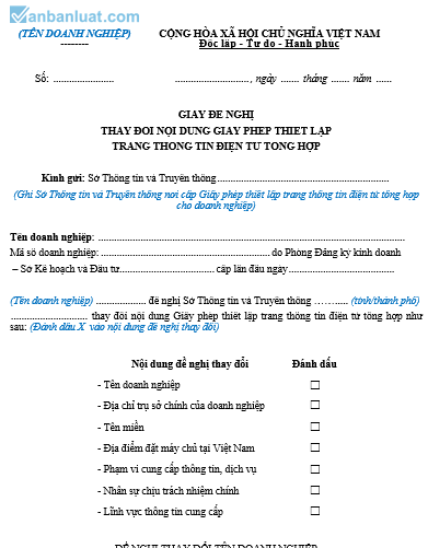 Giấy đề nghị thay đổi nội dung giấy phép thiết lập trang thông tin điện tử tổng hợp trong công ty TNHH một thành viên