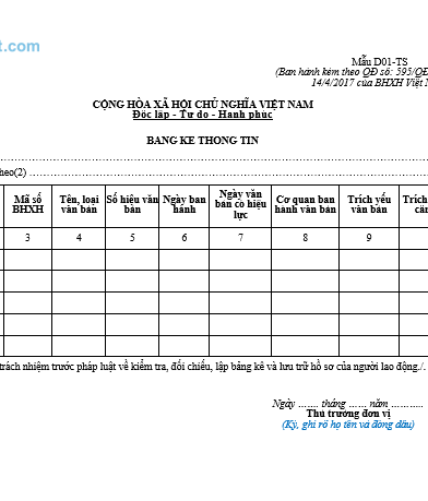 Mẫu Bảng kê thông tin về bảo hiểm - Mẫu D01-TS (Ban hành kèm theo QĐ số: 595/QĐ-BHXH ngày 14/4/2017 của BHXH Việt Nam)