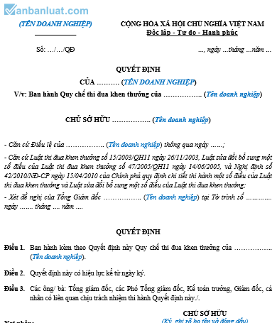 V/v: Ban hành Quy chế khen thưởng của …………….. (Tên doanh nghiệp)