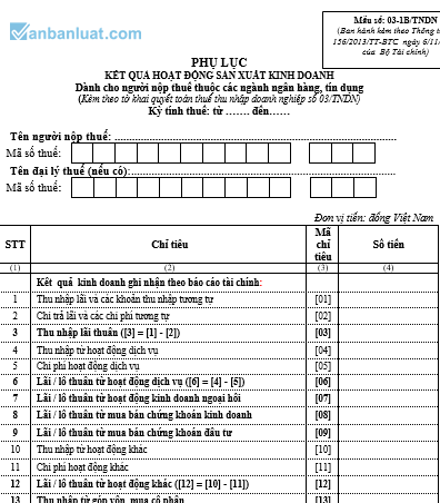 Phụ lục kết quả hoạt động sản xuất kinh doanh - Dành cho người nộp thuế thuộc các ngành ngân hàng, tín dụng (Ban hành kèm theo Thông tư số 156/2013/TT-BTC ngày 6/11/2013 của Bộ Tài chính)