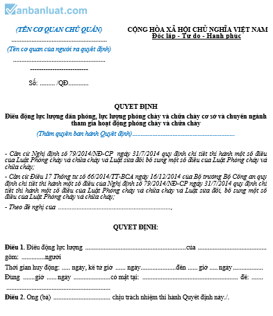 (TÊN CƠ QUAN CHỦ QUẢN) ......................................................... (Tên cơ quan của người ra quyết định) ....................................................... -------------------------- | CỘNG HÒA XÃ HỘI CHỦ NGHĨA VIỆT NAM |