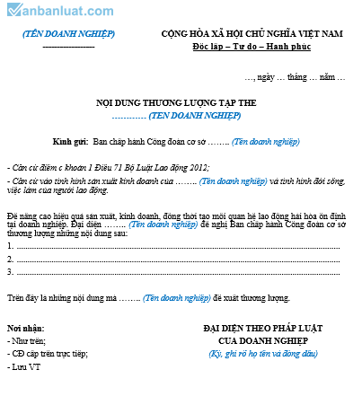 Để nâng cao hiệu quả sản xuất, kinh doanh, đồng thời tạo mối quan hệ lao động hài hòa ổn định tại doanh nghiệp. Đại diện …….. (Tên doanh nghiệp) đề nghị Ban chấp hành Công đoàn cơ sở thương lượng những nội dung sau: