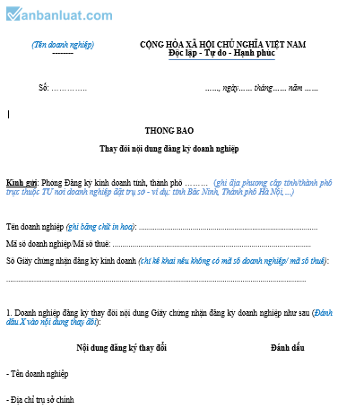THÔNG BÁO THAY ĐỔI THÔNG TIN ĐĂNG KÝ THUẾ