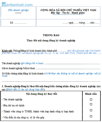 Doanh nghiệp đăng ký thay đổi nội dung đăng ký doanh nghiệp như sau: