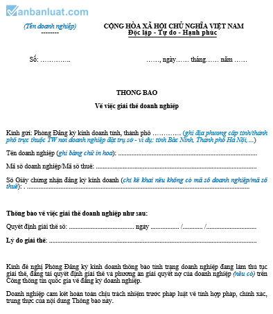 Thông báo về việc giải thể doanh nghiệp như sau: