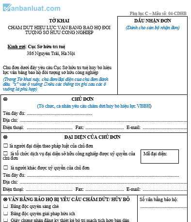 TỜ KHAICHẤM DỨT HIỆU LỰC VĂN BẰNG BẢO HỘ ĐỐI TƯỢNG SỞ HỮU CÔNG NGHIỆPKính gửi: Cục Sở hữu trí tuệ 386 Nguyễn Trãi, Hà Nội Chủ đơn dưới đây yêu cầu Cục Sở hữu trí tuệ hủy bỏ hiệu lực văn bằng bảo hộ đối tượng sở hữu công nghiệp (Trong Tờ khai này, chủ đơn/đại diện của chủ đơn đánh dấu "x" vào ô vuông nếu các thông tin ghi sau các ô vuông là phù hợp) | DẤU NHẬN ĐƠN(Dành cho cán bộ nhận đơn) | |||