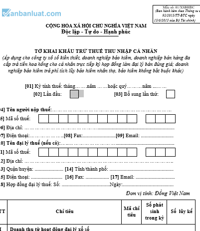 Tờ khai khấu trừ thuế thu nhập cá nhân - mẫu số 01/XSBHĐC - Mẫu số: 01/XSBHĐC (Ban hành kèm theo Thông tư số 92/2015/TT-BTC ngày 15/6/2015 của Bộ Tài chính)