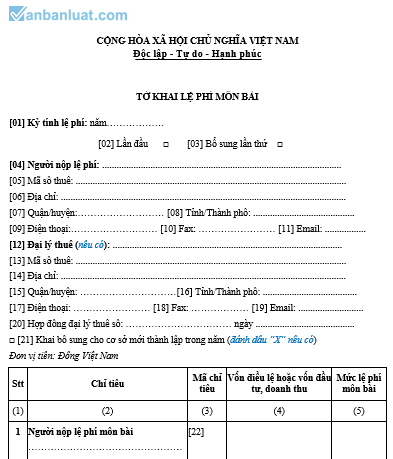 TỜ KHAI LỆ PHÍ MÔN BÀI