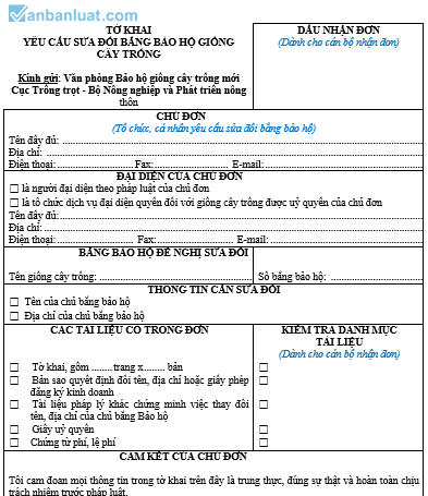 Tờ khai yêu cầu sửa đổi bằng bảo hộ giống cây trồng trong công ty TNHH một thành viên