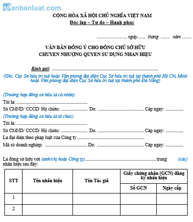 Tôi hoàn toàn đồng ý cho (anh/chị hoặc Công ty)............................. được chuyển quyền sử dụng sáng chế nêu trên.