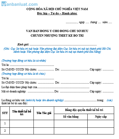 Tôi hoàn toàn đồng ý cho (anh/chị hoặc tên doanh nghiệp).............. được chuyển nhượng quyền   ............................................................. (quyền sử dụng, cho phép người khác sử dụng; ngăn cấm người khác sử dụng; định đoạt) đối với thiết kế bố trí nêu trên.
