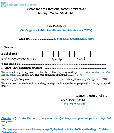 Tôi cam kết rằng, trong năm ....... tôi chỉ có thu nhập duy nhất tại ……… (tên tổ chức, cá nhân trả thu nhập) ….. nhưng ước tính tổng thu nhập không quá ……….. (*)