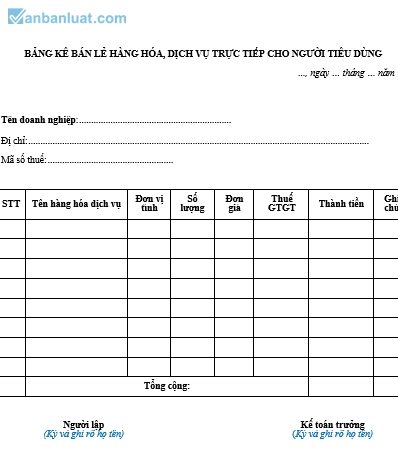 Bảng kê bán lẻ hàng hóa, dịch vụ trực tiếp cho người tiêu dùng trong doanh nghiệp tư nhân