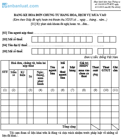 BẢNG KÊ HOÁ ĐƠN CHỨNG TỪ HÀNG HOÁ, DỊCH VỤ MUA VÀO