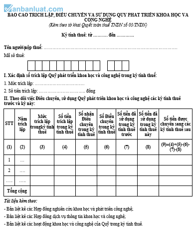 BÁO CÁO TRÍCH LẬP, ĐIỀU CHUYỂN VÀ SỬ DỤNG QUỸ PHÁT TRIỂN KHOA HỌC VÀ CÔNG NGHỆ