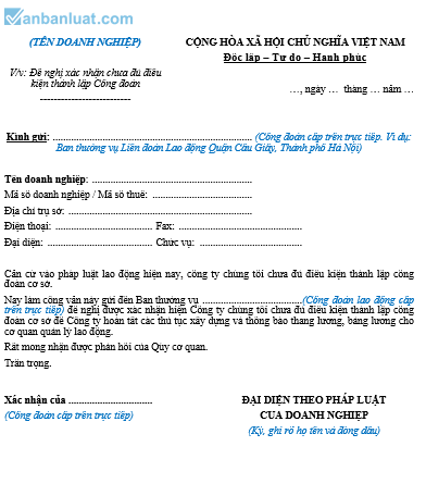 Công văn xác nhận chưa thành lập công đoàn cơ sở trong doanh nghiệp tư nhân