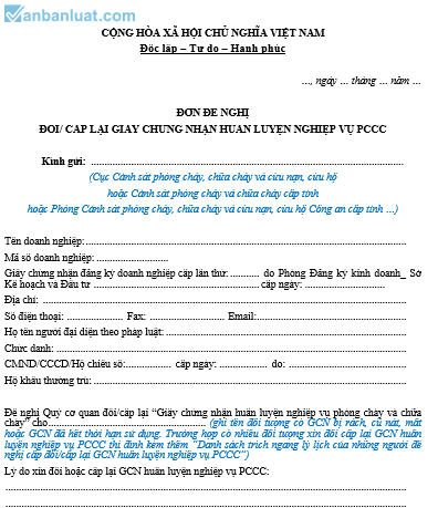 Đề nghị Quý cơ quan đổi/cấp lại “Giấy chứng nhận huấn luyện nghiệp vụ phòng cháy và chữa cháy” cho..................................................................... (ghi tên đối tượng có GCN bị rách, cũ nát, mất hoặc GCN đã hết thời hạn sử dụng. Trường hợp có nhiều đối tượng xin đổi cấp lại GCN huấn luyện nghiệp vụ PCCC thì đính kèm thêm “Danh sách trích ngang lý lịch của những người đề nghị cấp đổi/cấp lại GCN huấn luyện nghiệp vụ PCCC”)