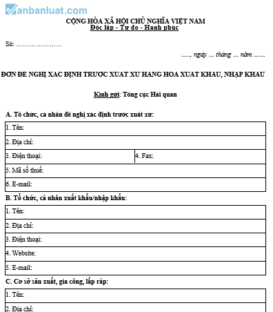 ĐƠN ĐỀ NGHỊ XÁC ĐỊNH TRƯỚC XUẤT XỨ HÀNG HÓA XUẤT KHẨU, NHẬP KHẨU
