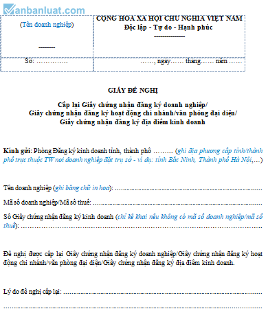 Đề nghị được cấp lại Giấy chứng nhận đăng ký doanh nghiệp/Giấy chứng nhận đăng ký hoạt động chi nhánh/văn phòng đại diện/Giấy chứng nhận đăng ký địa điểm kinh doanh.