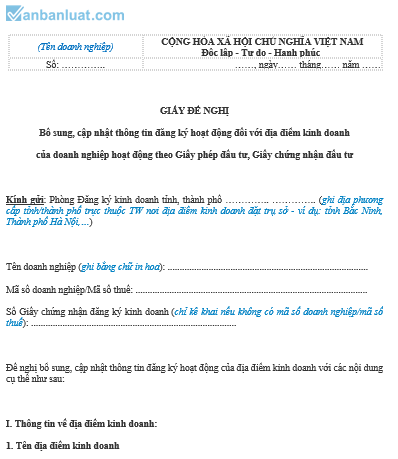 Đề nghị bổ sung, cập nhật thông tin đăng ký hoạt động của địa điểm kinh doanh với các nội dung cụ thể như sau: