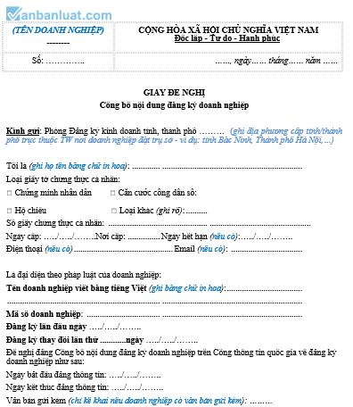 Đề nghị đăng công bố nội dung đăng ký doanh nghiệp trên Cổng thông tin quốc gia về đăng ký doanh nghiệp như sau: