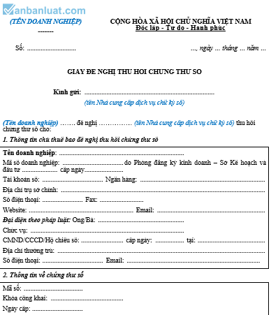 (Tên doanh nghiệp) ……. đề nghị …………… (tên Nhà cung cấp dịch vụ chữ ký số) thu hồi chứng thư số cho: