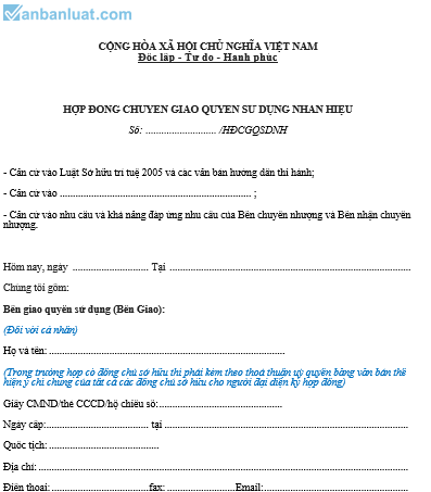 Bên Giao bằng văn bản này chuyển giao cho Bên Nhận quyền sử dụng nhãn hiệu tại .................. cho sản phẩm đã được đăng ký theo số đơn ............ nêu trên và Bên Nhận bằng văn bản này tiếp nhận quyền sử dụng nhãn hiệu theo đúng phương thức quy định trong Hợp đồng này.