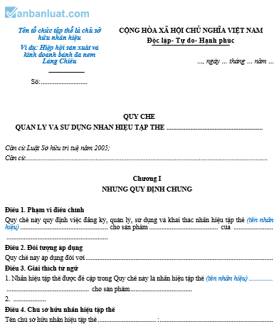 Quy chế này quy định việc đăng ký, quản lý, sử dụng và khai thác nhãn hiệu tập thể (tên nhãn hiệu) .............cho sản phẩm............................................ của ........................................................