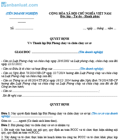 Điều 1: Nay quyết định thành lập Đội Phòng cháy và chữa cháy cơ sở tại (Tên cơ sở của doanh nghiệp)