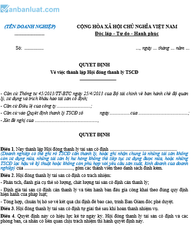 Điều 1. Nay thành lập Hội đồng thanh lý tài sản cố định ........................................................ (Doanh nghiệp có thể ghi rõ TSCĐ cần thanh lý, hoặc ghi nhận chung là những tài sản không còn sử dụng nữa, những tài sản bị hư hỏng không thể tiếp tục sử dụng được nữa, hoặc những TSCĐ lạc hậu về kỹ thuật hoặc không còn phù hợp với yêu cầu sản xuất, kinh doanh của doanh nghiệp) của ........................................................ , gồm các thành viên theo danh sách đính kèm.
