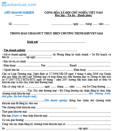 ........................................................... (Tên doanh nghiệp) thông báo chấm dứt chương trình khuyến mại đã đăng ký như sau: