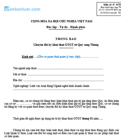 Thông báo chuyển đổi kỳ khai thuế GTGT từ quý sang tháng