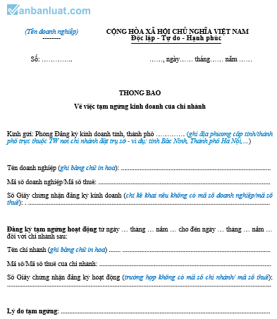 Về việc tạm ngừng kinh doanh của chi nhánh