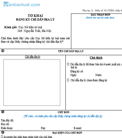TỜ KHAIĐĂNG KÝ CHỈ DẪN ĐỊA LÝKính gửi: Cục Sở hữu trí tuệ 386 Nguyễn Trãi, Hà Nội Chủ đơn dưới đây yêu cầu Cục Sở hữu trí tuệ xem xét đơn và cấp Giấy chứng nhận đăng ký chỉ dẫn địa lý * | DẤU NHẬN ĐƠN(Dành cho cán bộ nhận đơn) | |||||||