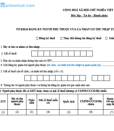 TỜ KHAI ĐĂNG KÝ NGƯỜI PHỤ THUỘC CỦA CÁ NHÂN CÓ THU NHẬP TỪ TIỀN LƯƠNG, TIỀN CÔNG