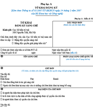 Tờ khai đăng ký sáng chế trong doanh nghiệp tư nhân