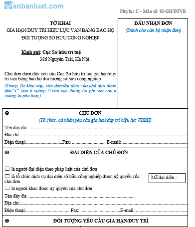 Tờ khai gia hạn hiệu lực văn bằng bảo hộ đối tượng sở hữu công nghiệp - mẫu 02-GH/DTVB quy định tại Phụ lục C ban hành kèm theo Thông tư 16/2016/TT-BKHCN