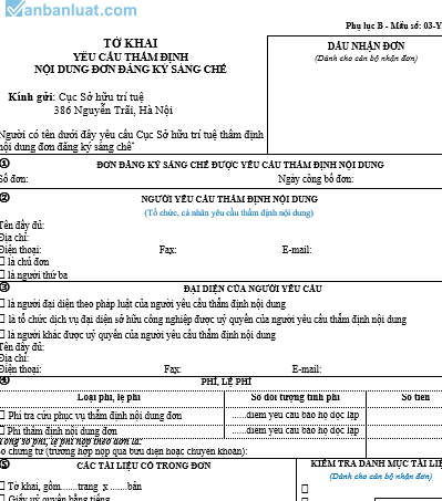 Tờ khai yêu cầu thẩm định nội dung đơn đăng ký sáng chế - mẫu 03-YCTĐ quy định tại Phụ lục B ban hành kèm theo Thông tư 01/2007/TT-BKHCN