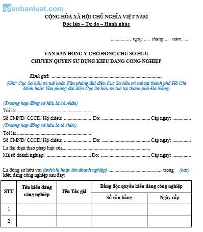 Văn bản đồng ý cho đồng sở hữu chuyển quyền sử dụng kiểu dáng công nghiệp trong doanh nghiệp tư nhân