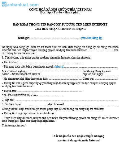 Đề nghị Nhà đăng ký kiểm tra và thẩm định về bản khai thông tin đăng ký sử dụng tên miền Internet của bên nhận chuyển nhượng quyền sử dụng tên miền Internet ............................................................. với các thông tin cụ thể như sau: