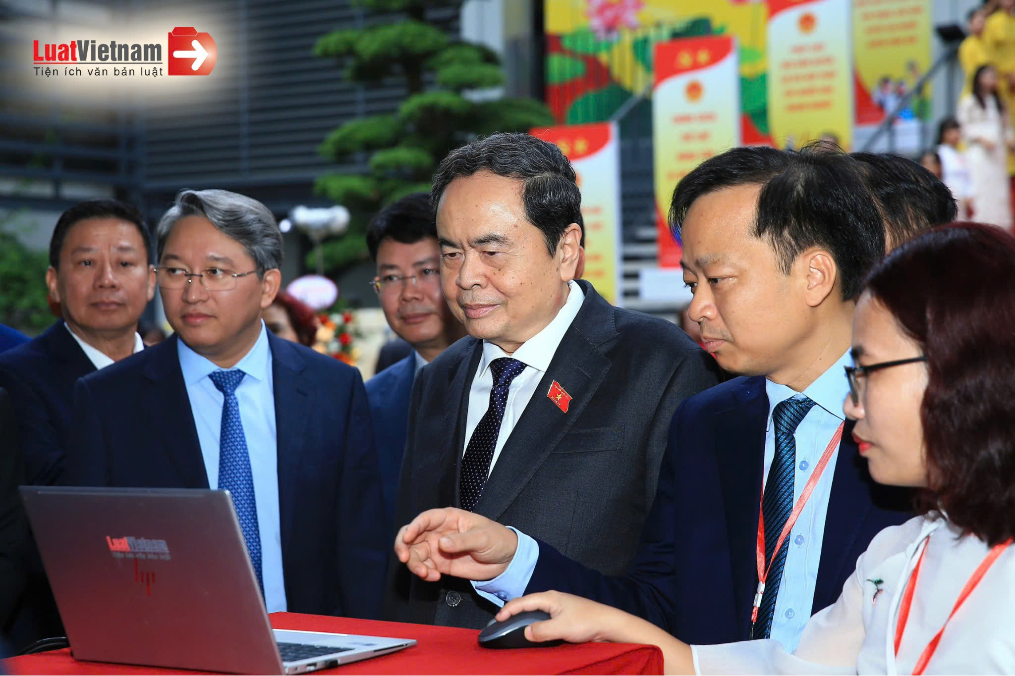 Trong không gian triển lãm của buổi lễ, LuatVietnam giới thiệu AI pháp luật trên Cổng Pháp luật quốc gia, với phiên bản voice dành cho người dùng. Chủ tịch Quốc hội Trần Thanh Mẫn cùng các đại biểu khác đã trực tiếp trải nghiệm AI pháp luật.