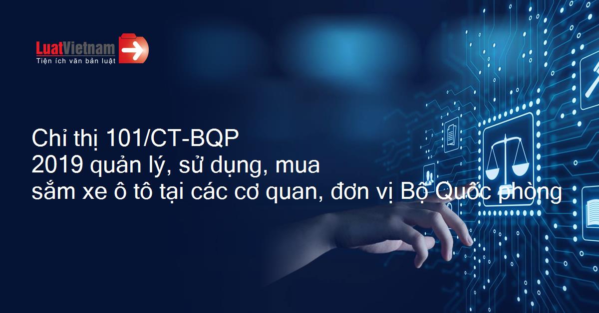 Ngày 21/11/2019, Bộ Quốc phòng ban hành Chỉ thị 101/CT-BQP về việc tăng cường công tác quản lý, sử dụng và mua sắm xe ô tô tại các cơ quan, đơn vị trong Bộ Quốc phòng.